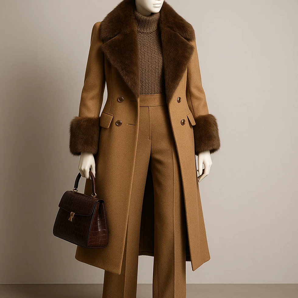 全体像:キャメルのロングコート(ふっくらリッチなファー襟&カフ)に、同系キャメルのハイウエストスラックスとモカの畝タートル。バッグはチョコブラウンの型押しレザー。ワントーンでまとめた“ラグジュアリー・ウィンター”。