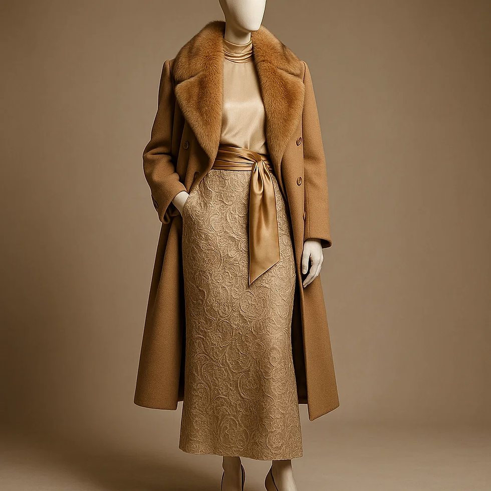 全体像:キャメルのファーカラー付きロングコートに、同系ゴールドベージュのドレープブラウス+ジャカードタイトスカート。ウエストはサテンリボンでマークし、ワントーンで仕上げた“ラグジュアリー・モノクローム”。