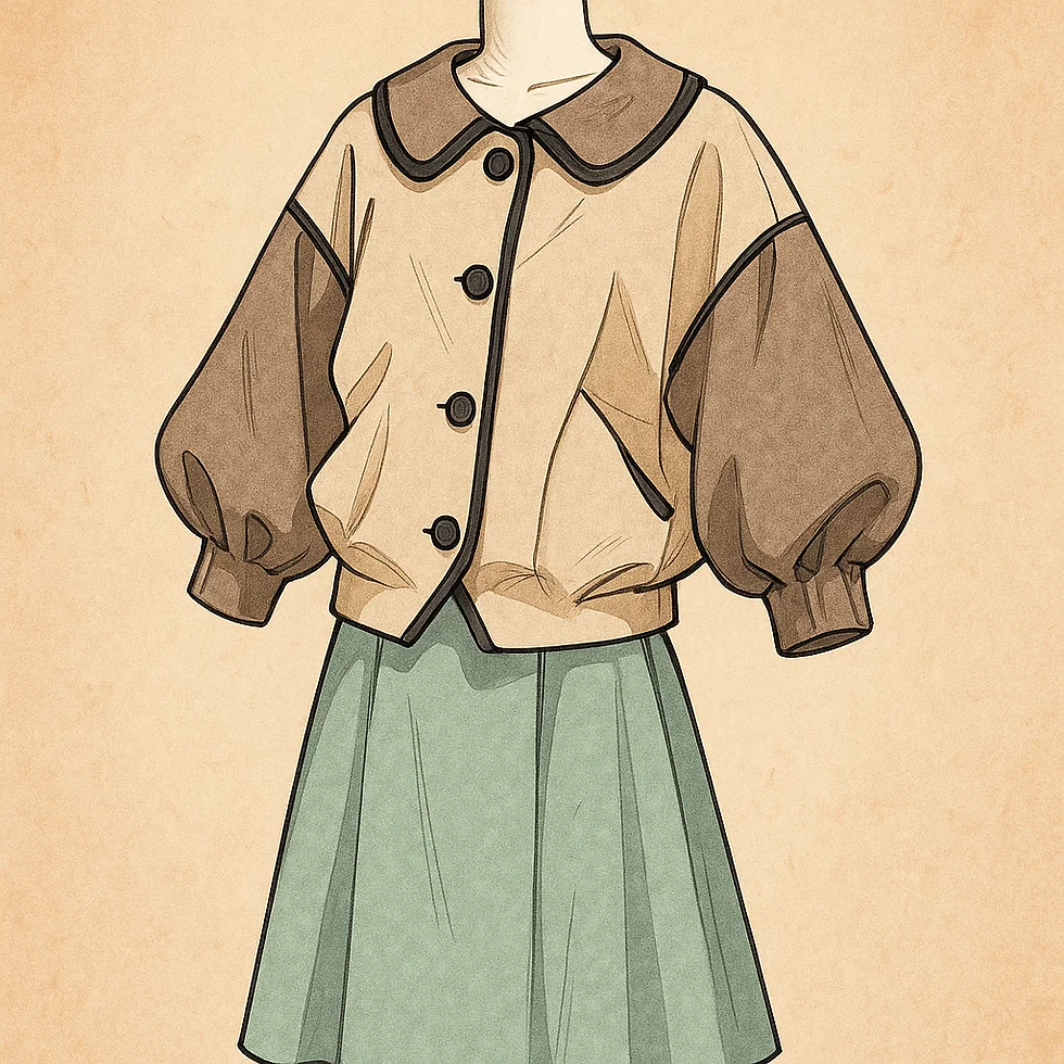 ブルゾン:ドロップショルダー+たっぷりバルーン袖を袖口カフでキュッと収束。裾は短丈でわずかにゴム寄せ(ふくらみをキープ)。丸衿と前立ての曲線でやさしい表情。